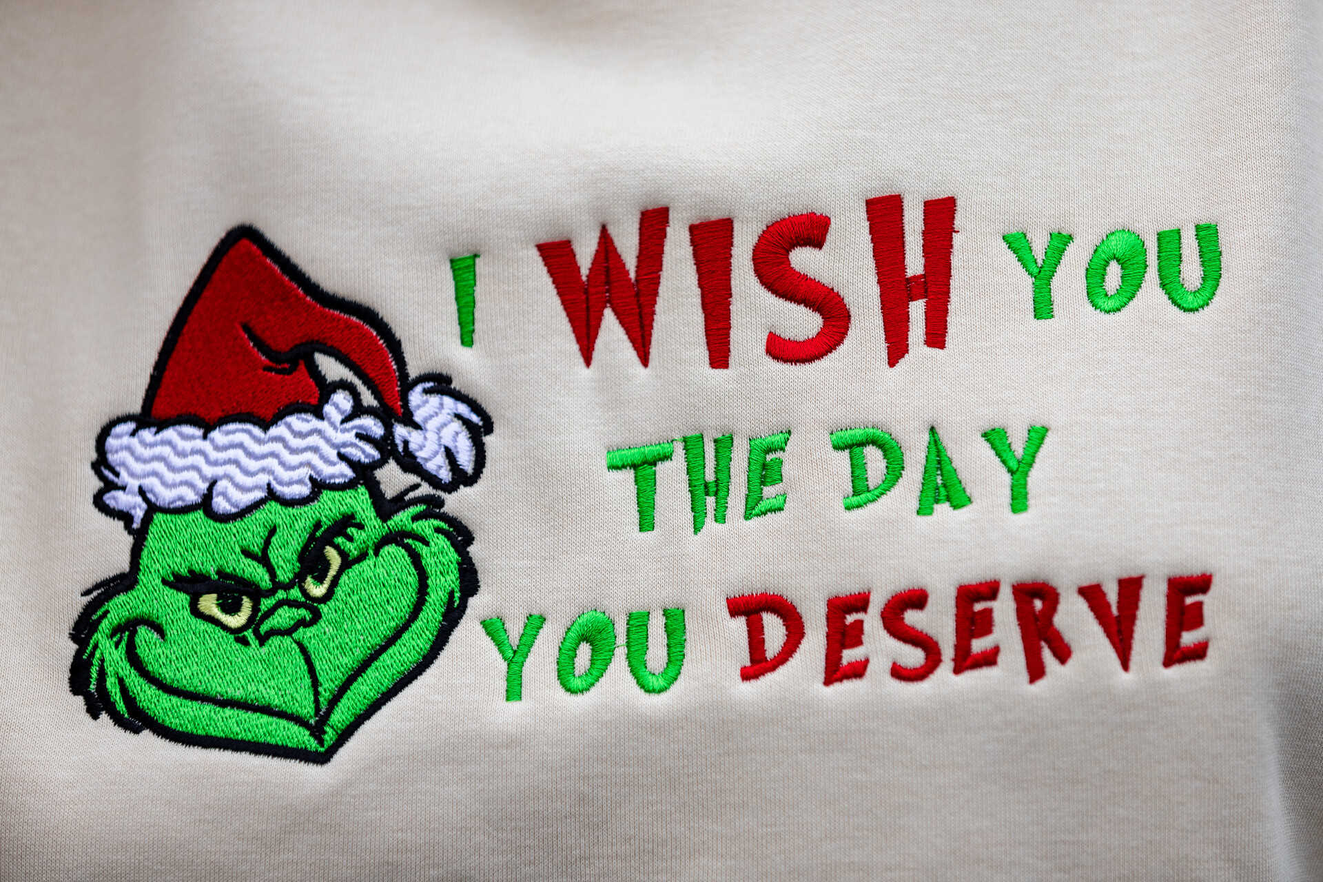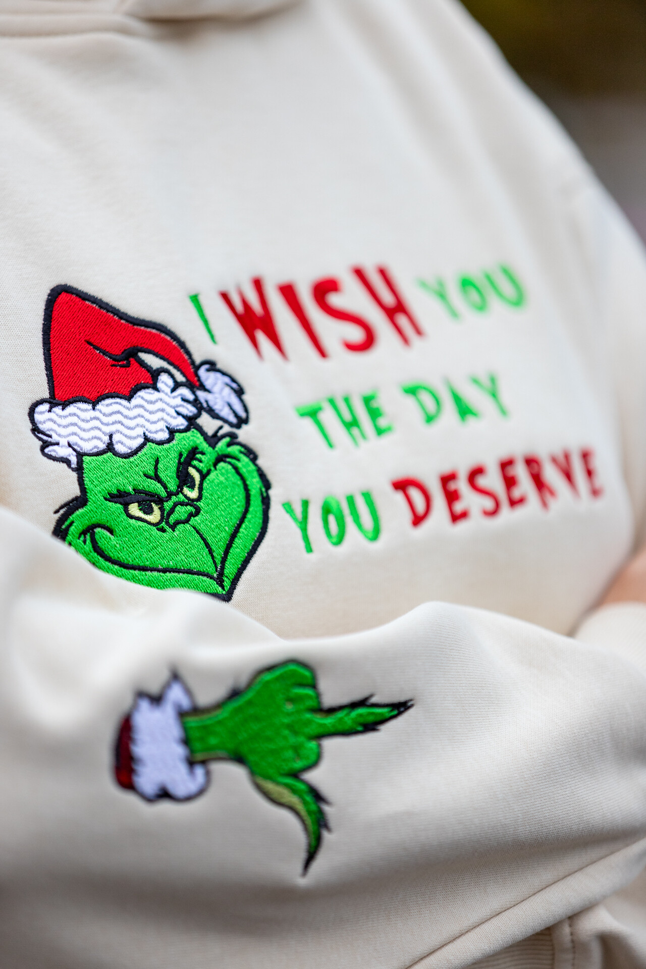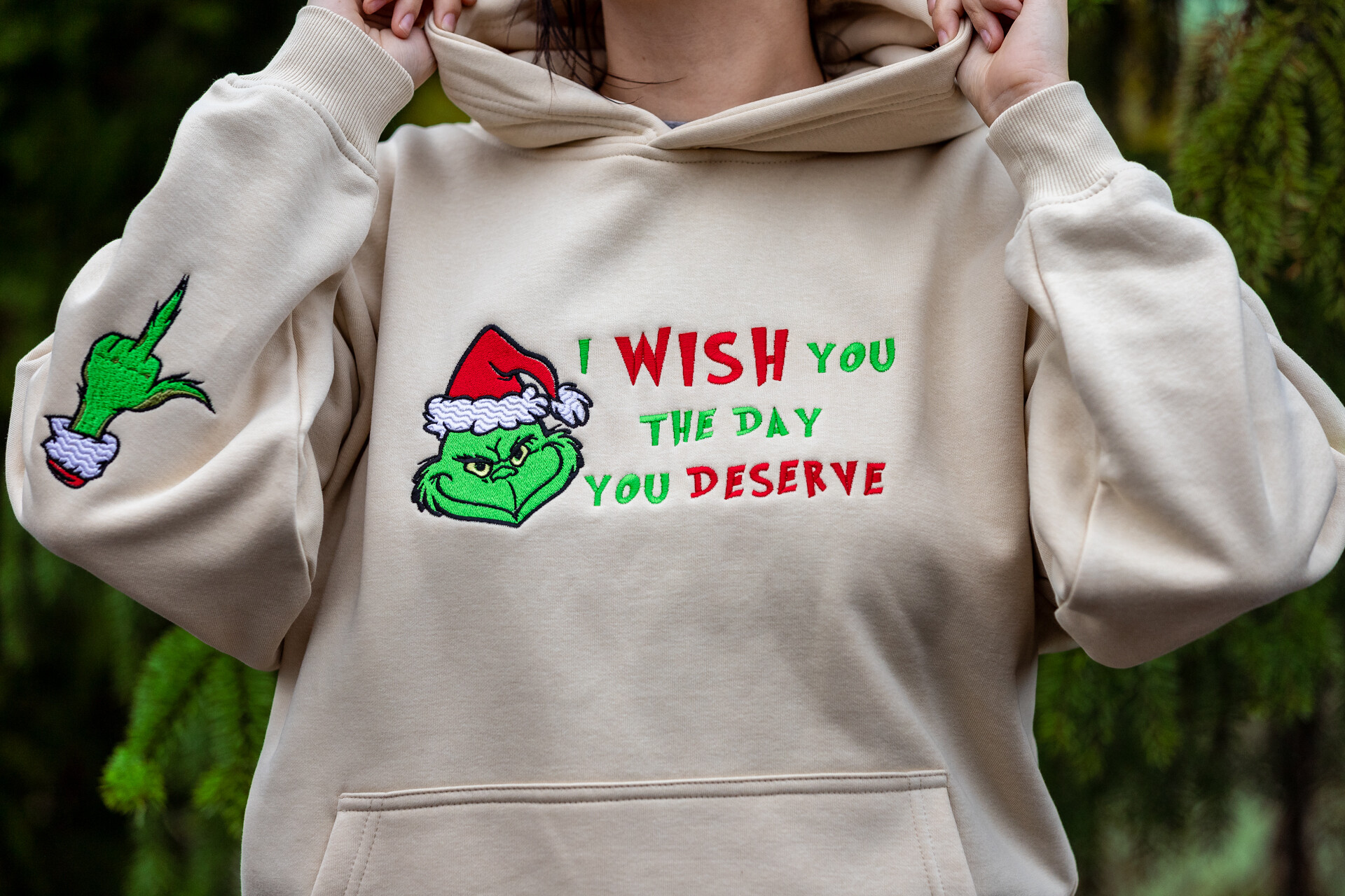 I wish you the day you deserve - to świąteczna bluza z subtelnym przekazem, która sprawdzi się na każdym spotkaniu, czy to rodzinnie, czy firmowo, a dodatkowy haft na lewym rękawie doda jej charakteru.