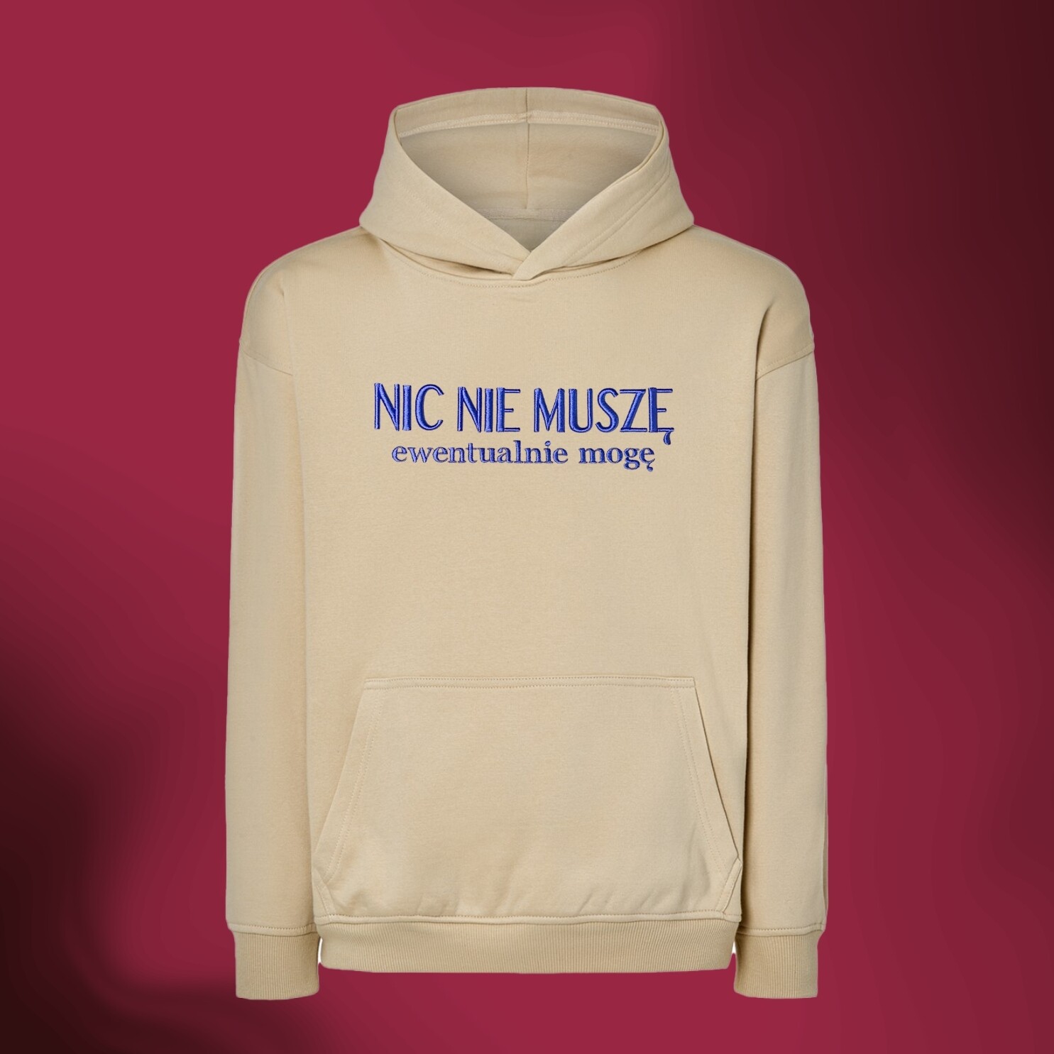 Bluza z haftem 3D „NIC NIE MUSZĘ, ewentualnie mogę” jest idealna na te dni, kiedy nawet „mogę” brzmi podejrzanie optymistycznie.