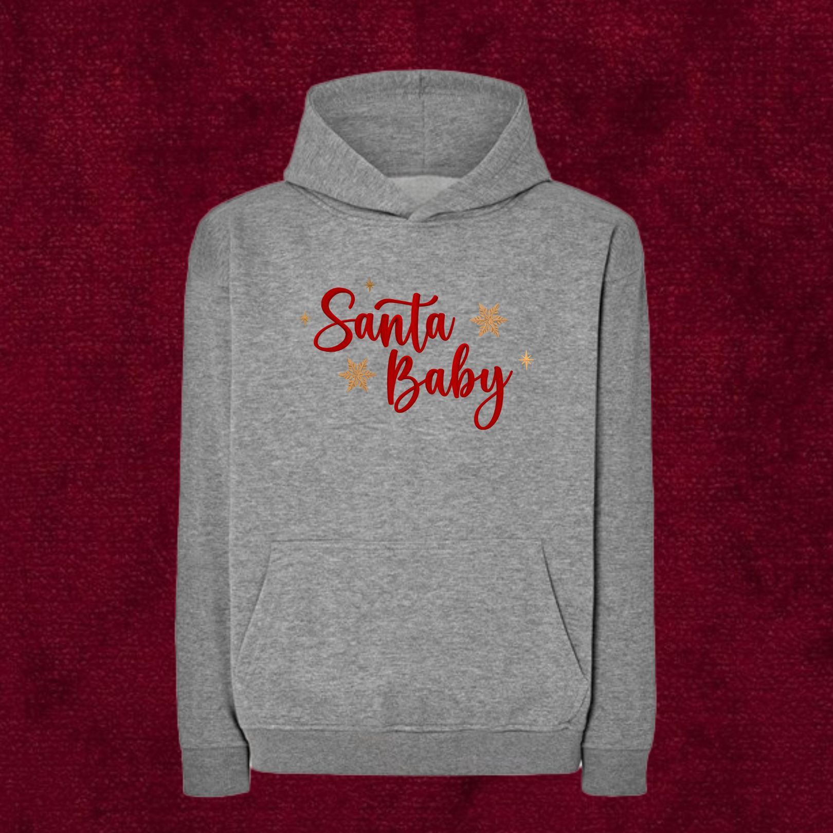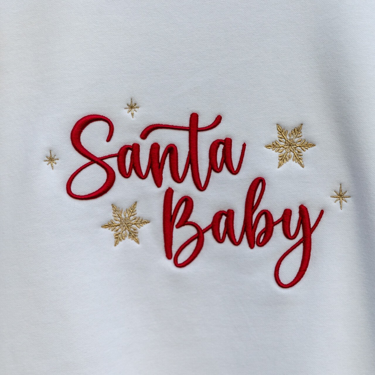 Główny napis „Santa Baby” wykonany w technice haftu 3D – wypukły, aksamitny w dotyku, nie pęka i nie blaknie. Dopełnienie stanowią delikatne śnieżynki i gwiazdki naszyte złotą nicią – subtelnie odbijają światło choinkowych lampek.